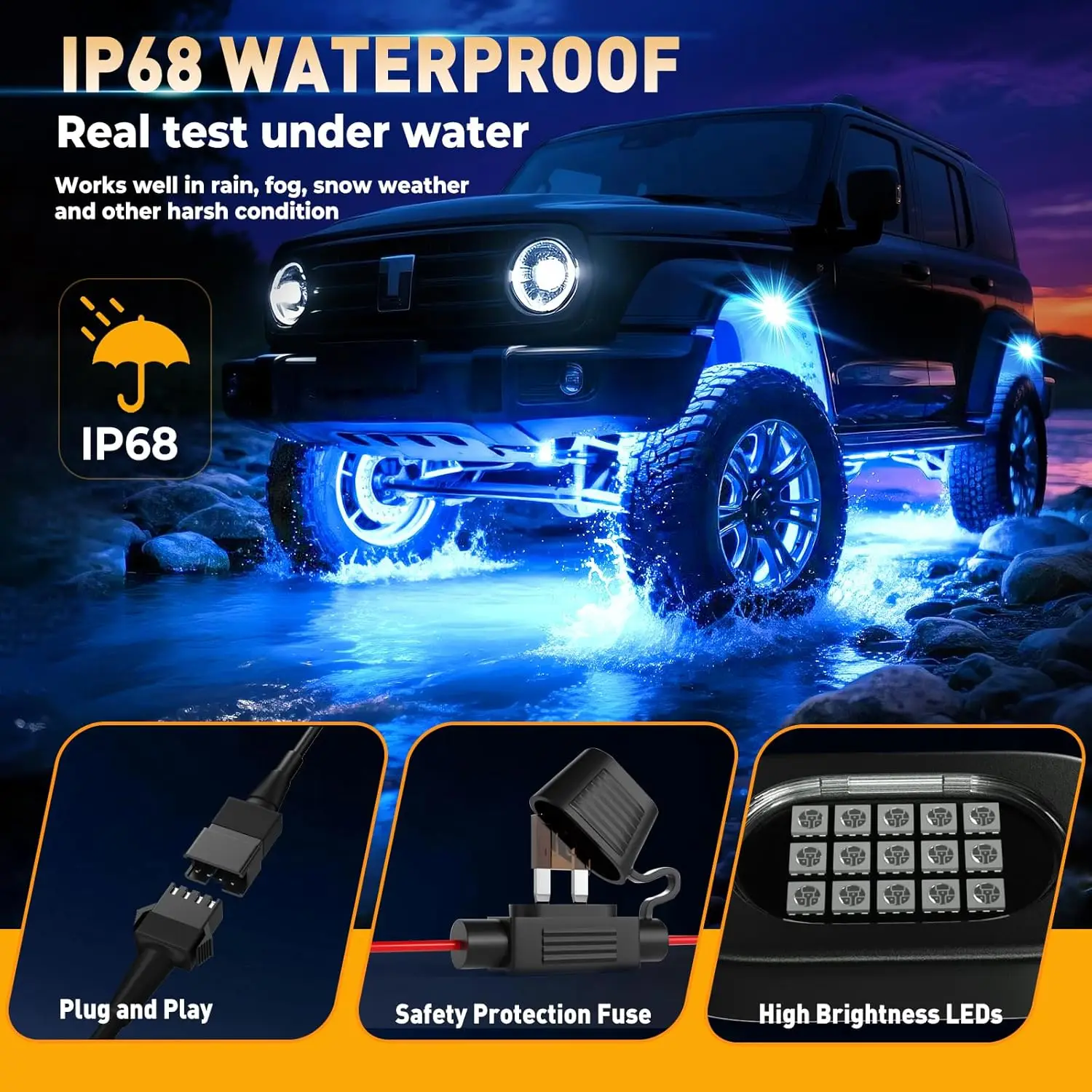 RGB Car Rock Lights can be widely use for pickup, off-road, truck, ATV, UTV, RZR, full size SUV, Buggy, Motorbike, Raptor, Ranger and boat etc.